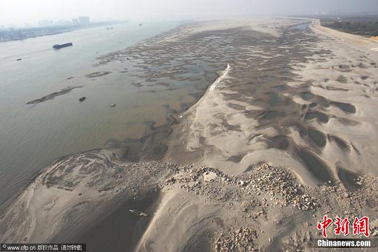 12月7日,在長江武漢市天興洲水域,大量沙洲露出江面,形成大大小小的沙丘,分布在水岸。據(jù)悉,近期,由于長江中下游地區(qū)持續(xù)多日的干燥少雨的天氣,長江漢口水位接近枯水期的標(biāo)植。