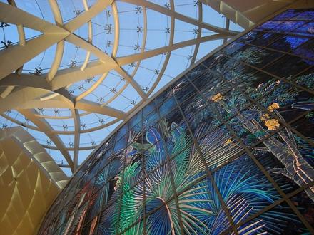 上海文化廣場(chǎng)地下音樂(lè)廳丁紹光壁畫(huà)《生命之源》完成 被切割開(kāi)來(lái)的小玻璃,最后拼裝起來(lái),組成了《生命之源》。16米高的壁畫(huà)上,匯集了30萬(wàn)塊切割成各種形狀的小塊彩色玻璃。為了讓作品看起來(lái)更通透,彩色玻璃貼在了半透明的無(wú)色玻璃上。 站在300多平方米的巨幅壁畫(huà)《生命之源》前面,旅美藝術(shù)家丁紹光松了一口氣。半年多的苦思冥想和艱難勞作,終于告一段落。再過(guò)幾個(gè)月,新建成的上海文化廣場(chǎng)地下音樂(lè)廳就將正式開(kāi)放,這件壁畫(huà),是它的門(mén)臉。