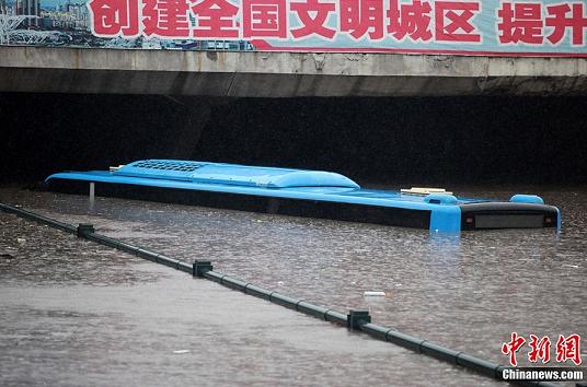 7月26日,突襲津城的大到暴雨致使天津塘沽河北路地道被淹,積水超過2米。圖為一輛駛入地道的公交車被積水淹沒。