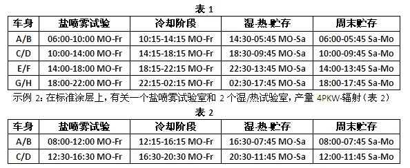 示例1:在5:30-22:30的生產運行時間上,有關一個鹽噴霧和4個濕熱試驗室(表1)每個試驗循環周期改裝時間大2次15分鐘, 產量8PKW-車身。