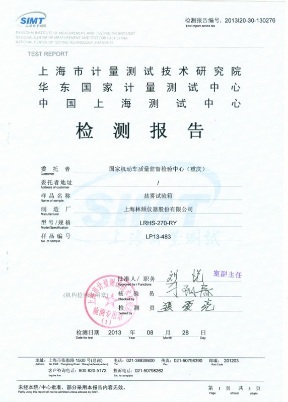 中國汽車工程研究院股份有限公司(股份代碼:601965)始建于1965年,注冊資金6.4億,為國內主要的汽車研發機構之一,并被科技部授予“國際科技合作基地”,日前,因試驗室檢測條件需要,在我司定購一臺鹽霧試驗箱(型號LRHS-270-RY),經內部標準測試后再送入第三方計量并出具合格報告,此臺產品將放置于國家機動車質量監督檢驗中心(重慶)檢測使用。