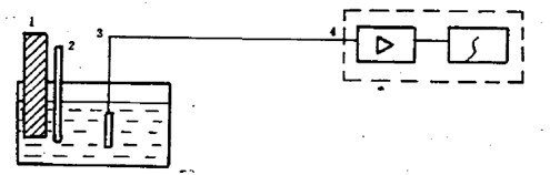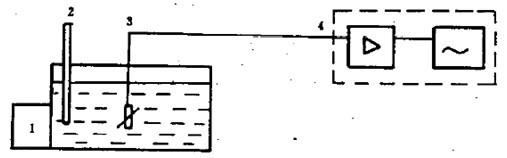 1:溫度控制儀、2:玻璃棒溫度計、3:溫度傳感器、4:數字電壓表(測量放大、自動顯示) 循環式恒溫水槽按圖4所表表示的方法,將溫度傳感器置于循環杯的幾何中心,進行15min的連續測試記錄。