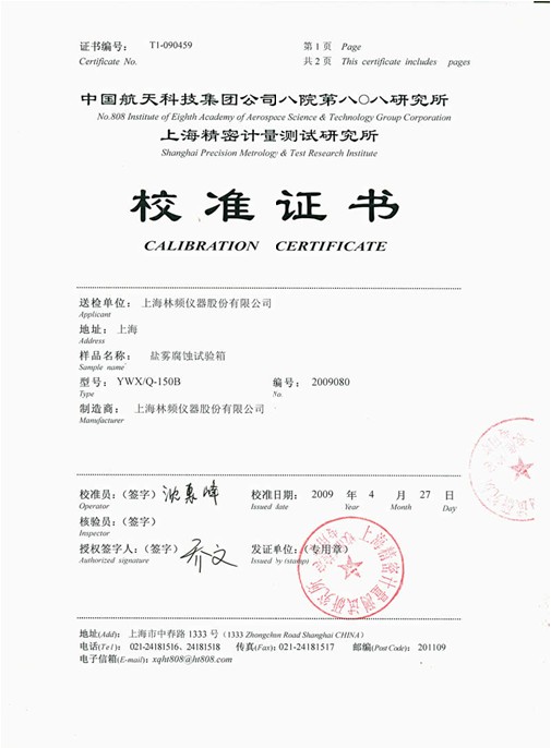 首頁 > 新聞中心 > 林頻股份—鹽霧腐蝕試驗箱校準證書