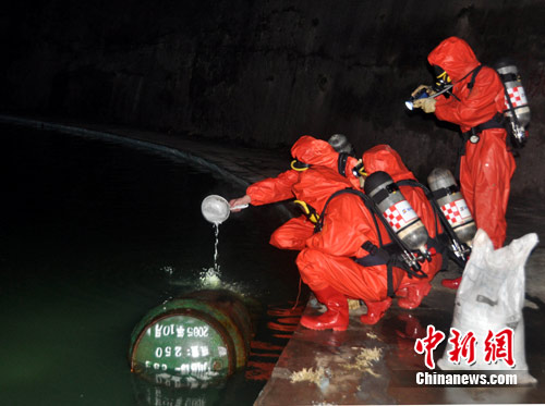 26日晚22時10分左右,四川廣元市區棲鳳路一游泳場發生氯氣泄漏事故,現場緊急疏散上千人民眾,有多人出現不同程度中毒。圖為消防官兵現場稀釋泄漏氯氣。中新社發 唐俊勇 攝